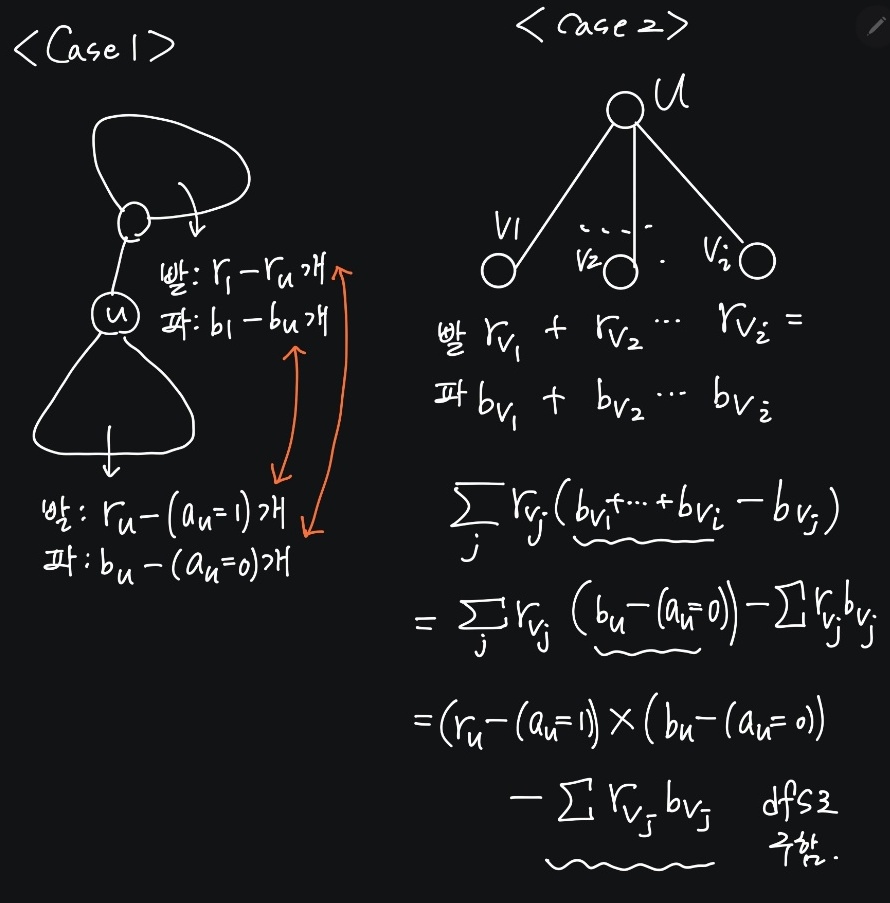 case 2. 서로 다른 u의 서브노드에서 빨, 파를 선택하는 경우