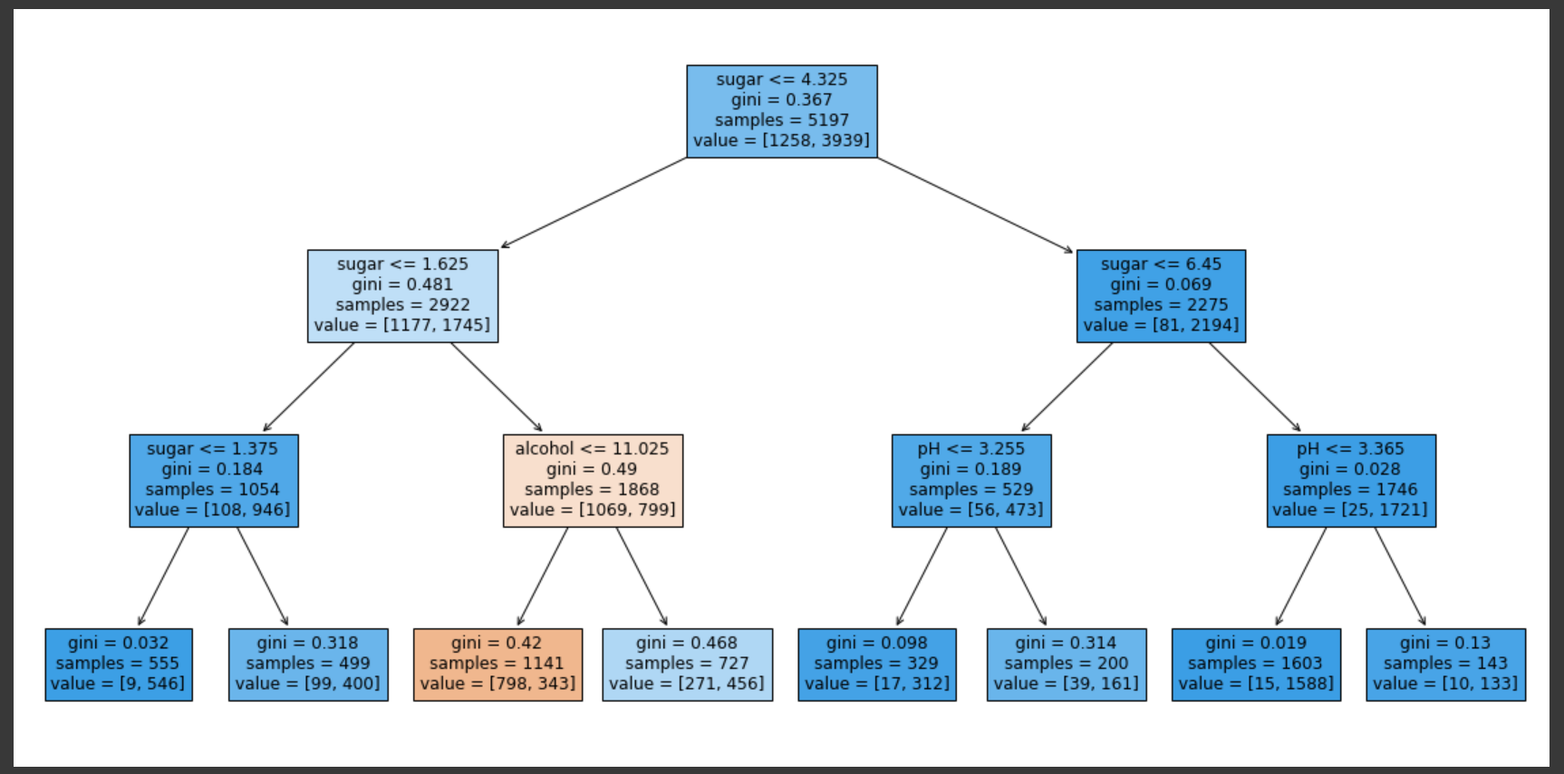 알코올 농도나 pH에 따라 분류해주고 있음을 알 수 있습니다. 이렇게 루트노드 쪽에서 먼저 기준을