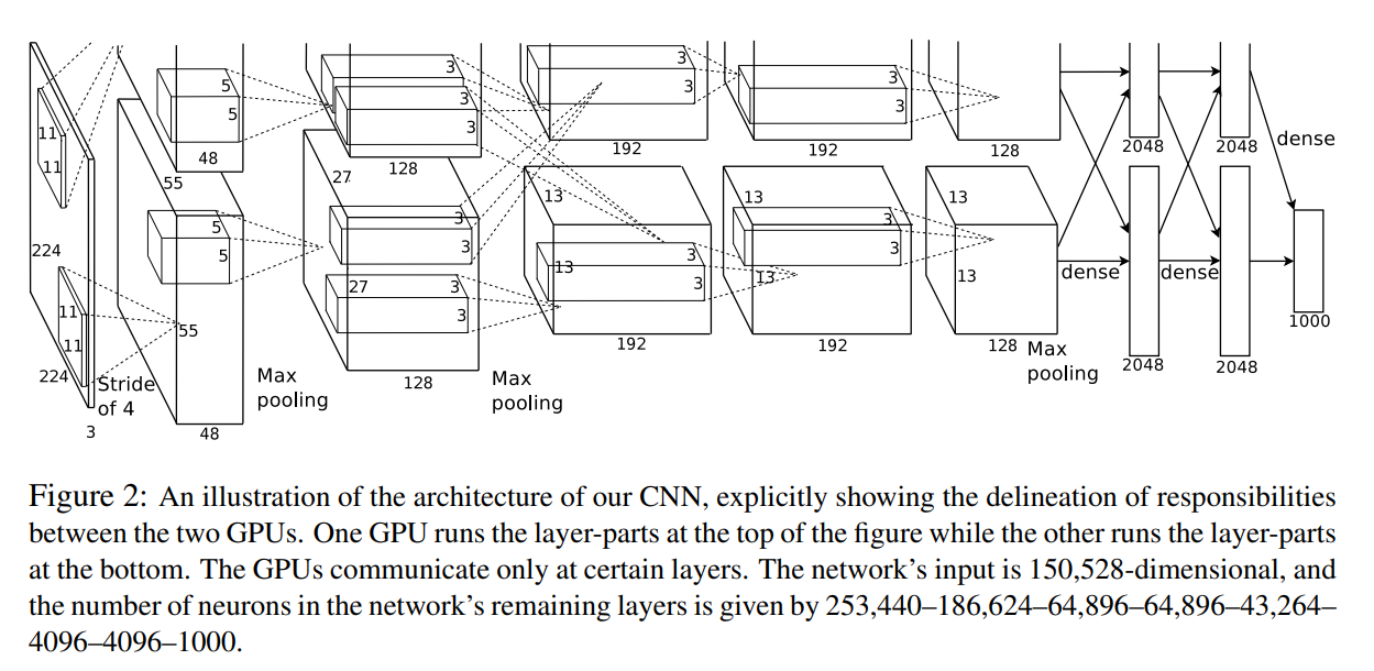 성능이 더 좋았으며, 현재는 AlexNet이 비교적 작은 모델에 속하지만, 당시에는 엄청 큰 규모의 모델이라서