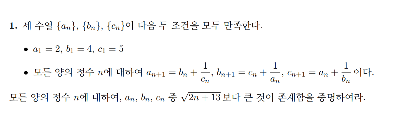 \(s_n^2=a_n^2+b_n^2+c_n^2>6n+39 \)을 보이면 비둘기집 원리에 의해 \(\sqrt{2n+13}\)보다 큰게 반드시 존재한다.