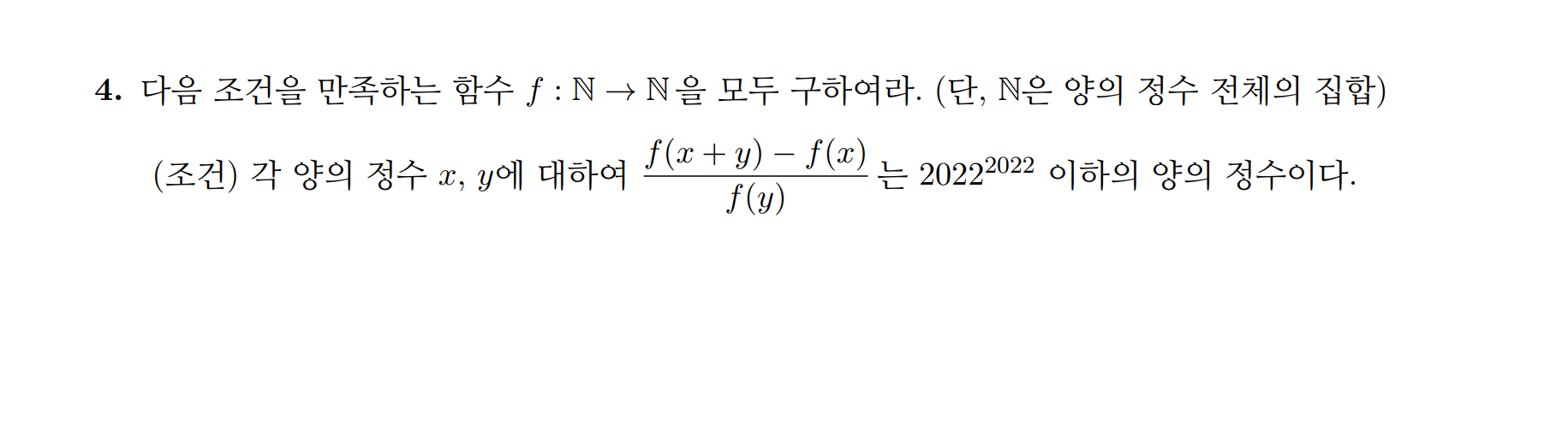 또한, 항상 \(f(x+y)>f(x)\)이므로, \(f(x)\)는 증가함수이다.